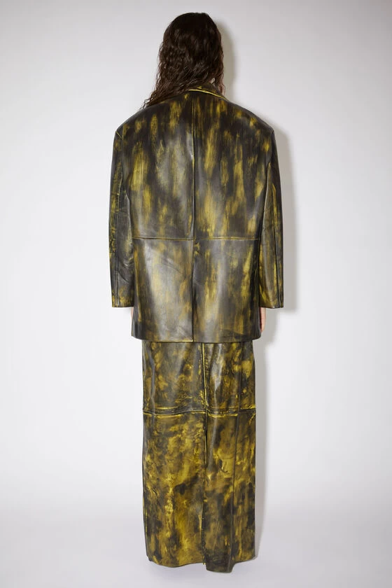 Acne Studios yellow/black tailored jacket is crafted from leather with a painted finish. Detailed with a centre front button-up closure and cut to an oversized fit with dropped shoulders and elongated sleeves.