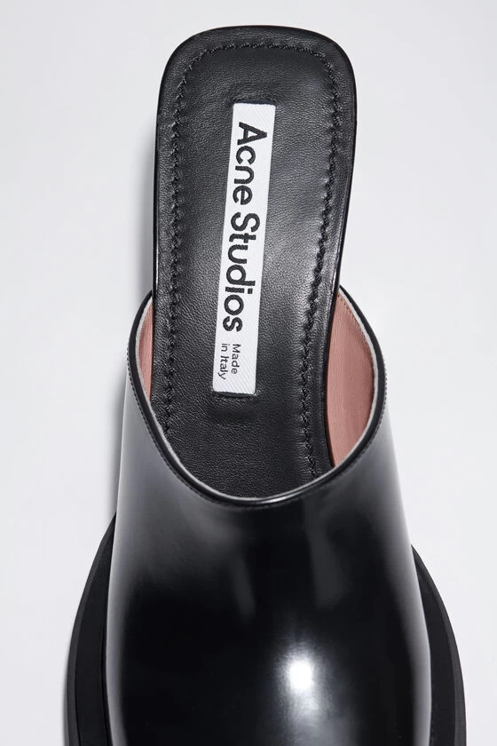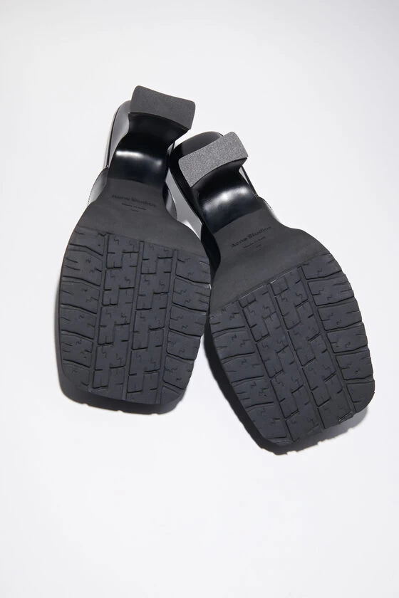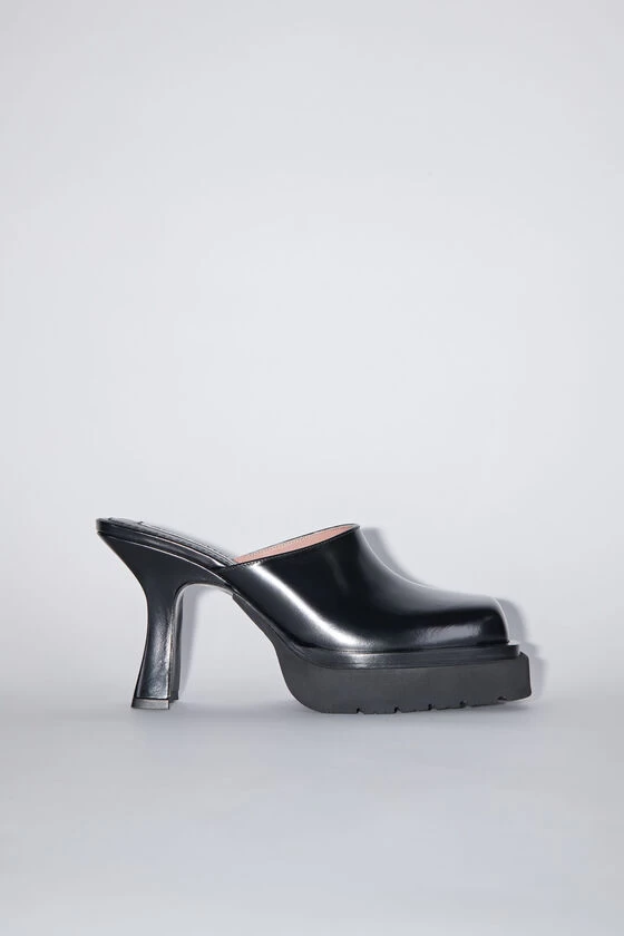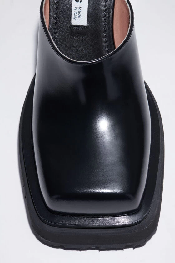Acne Studios black mules are crafted from brushed leather with a square toe. Complete with a rubber sole and a platform rectangular heel.