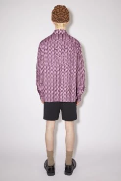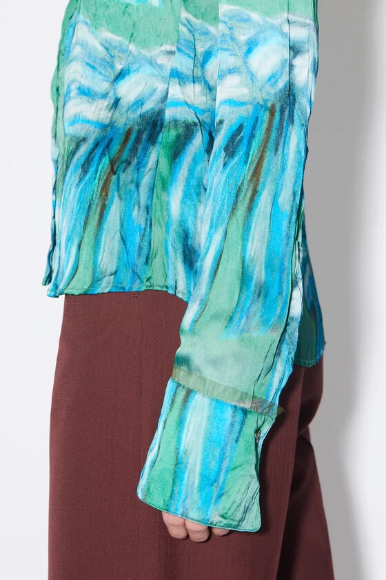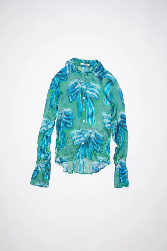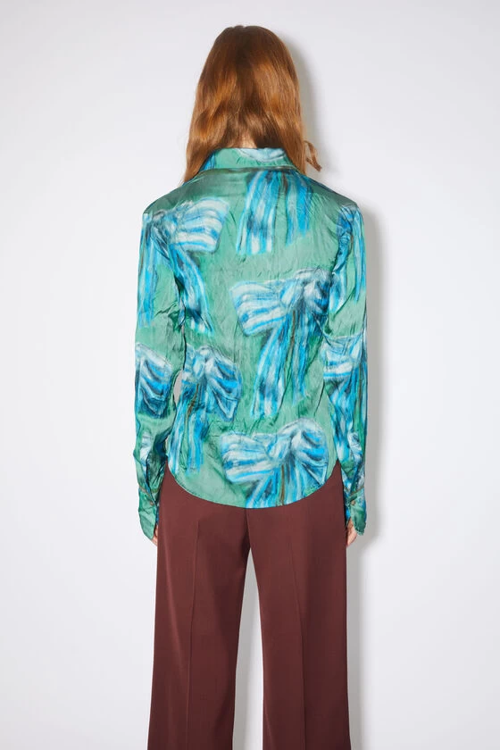 Acne Studios green button-up shirt features an exclusive bow print by artist Karen Kilimnik, crafted from fluid satin fabric. Cut to a regular fit with elongated sleeves and a regular length.