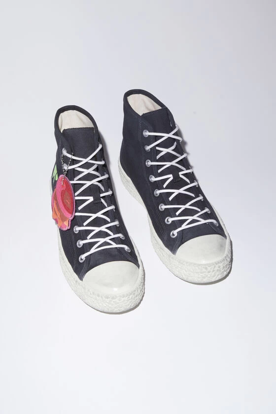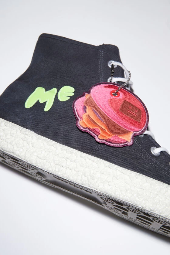 Acne Studios black/off white high top sneakers feature a printed animation and a burger key chain. Crafted from cotton with a tumbled finish and rubber soles.