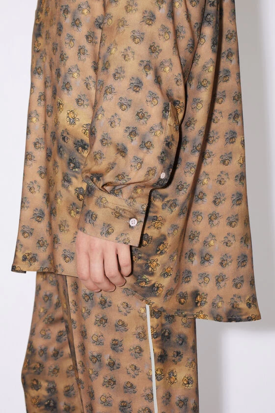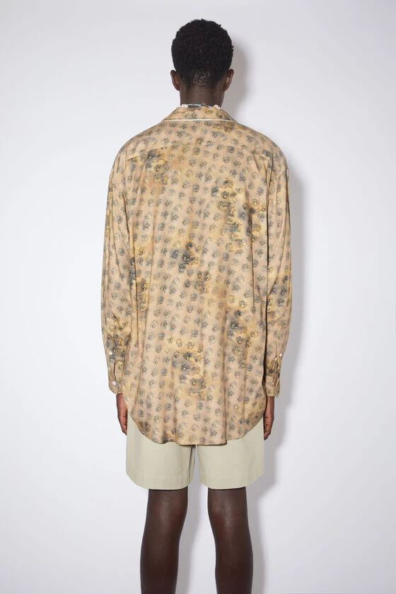 Acne Studios sand beige/yellow button-up shirt features an exclusive faded roses print and contrast piping at the placket and collar. Crafted from fluid satin fabric and cut to a relaxed fit.