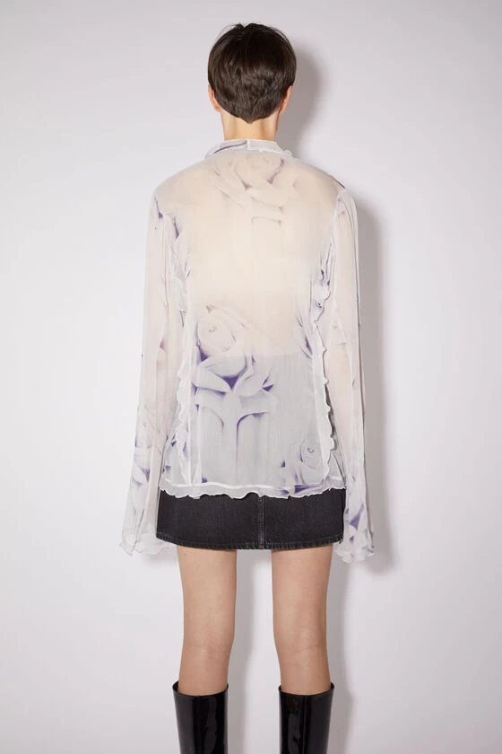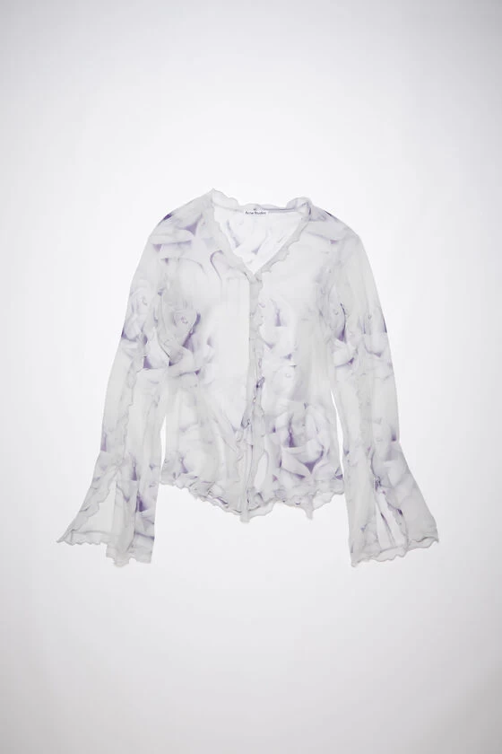 Acne Studios white button-up shirt features a seasonal print, crafted from silk. Detailed with ruffles and sleeve slits. Cut to a relaxed fit with a hip length.