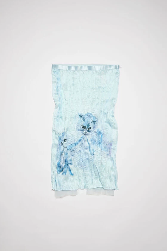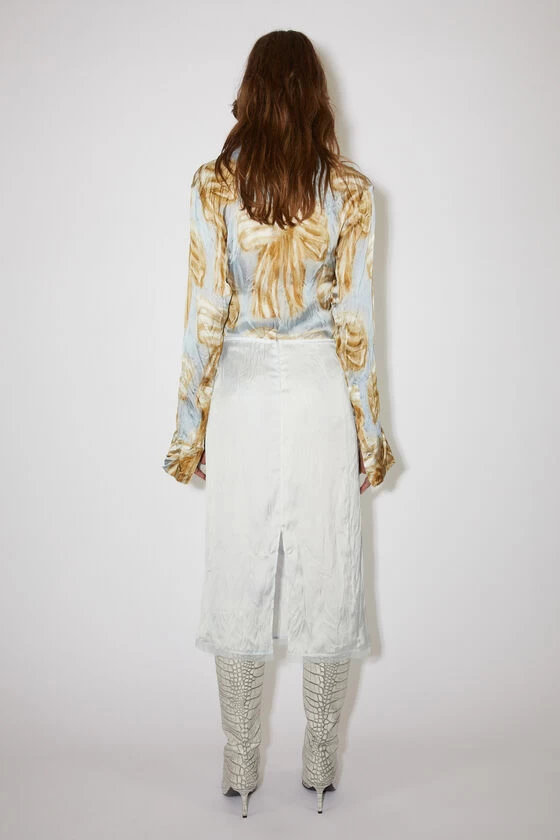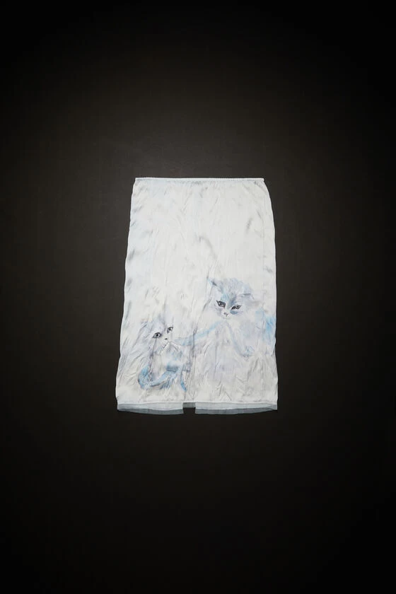Acne Studios light blue skirt features an artwork print by artist Karen Kilimnik, crafted from satin fabric with a fluid finish. Detailed with contrast trim on the waist and visible raw edge lining on the bottom. Cut to a regular fit and mid-length.