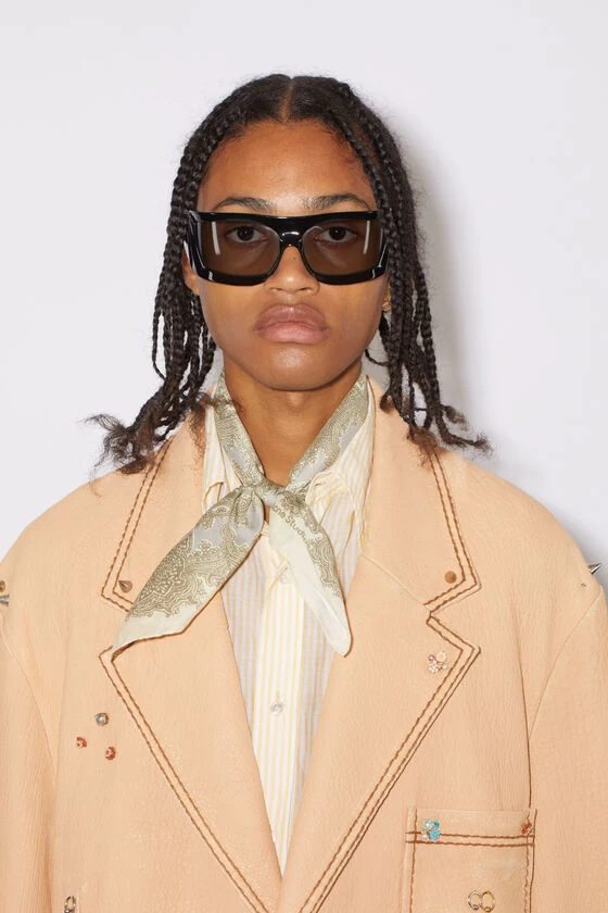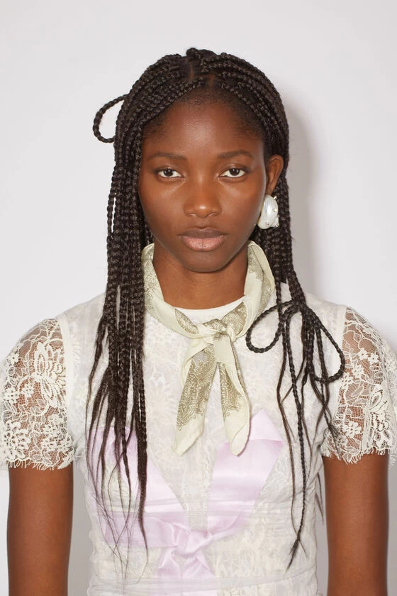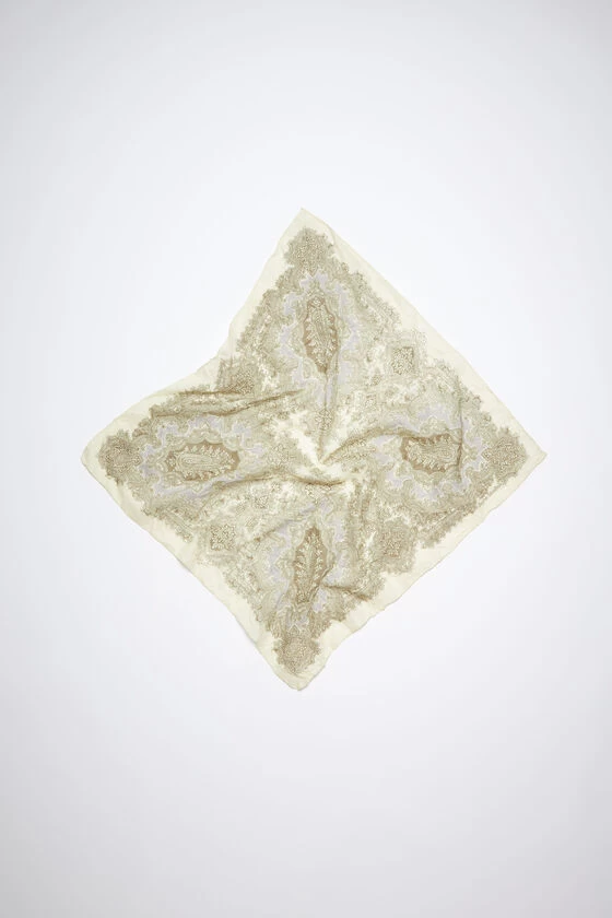 Acne Studios cream white/light olive scarf features a paisley design and is crafted from a cotton and silk blend with a crinkled finish.