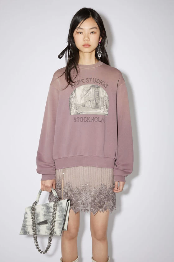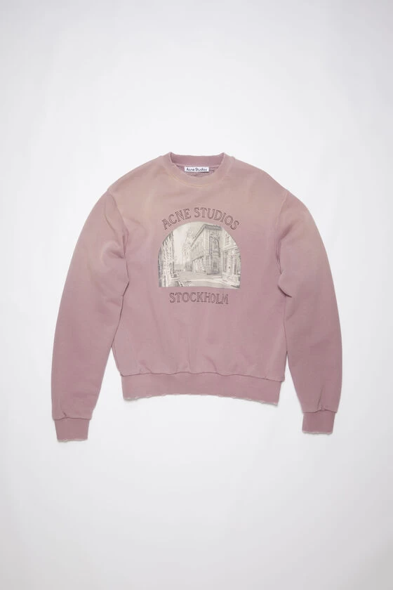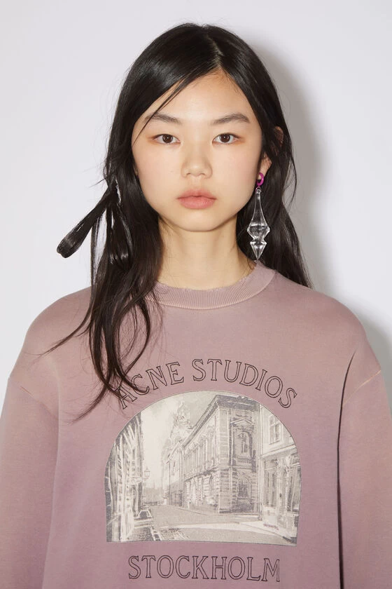 Acne Studios dusty purple crewneck sweatshirt features a seasonal Acne Studios screen print on the front, crafted from a cotton blend with a faded finish. Cut to a relaxed fit.