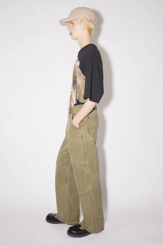 Acne Studios khaki beige trousers are crafted from canvas cotton with a pigment dyed finish. Detailed with a leather face logo patch on the back waistband. Complete with front slanted pockets, a coin pocket and back patch pockets. Cut to a regular unisex fit with a low rise and long length.