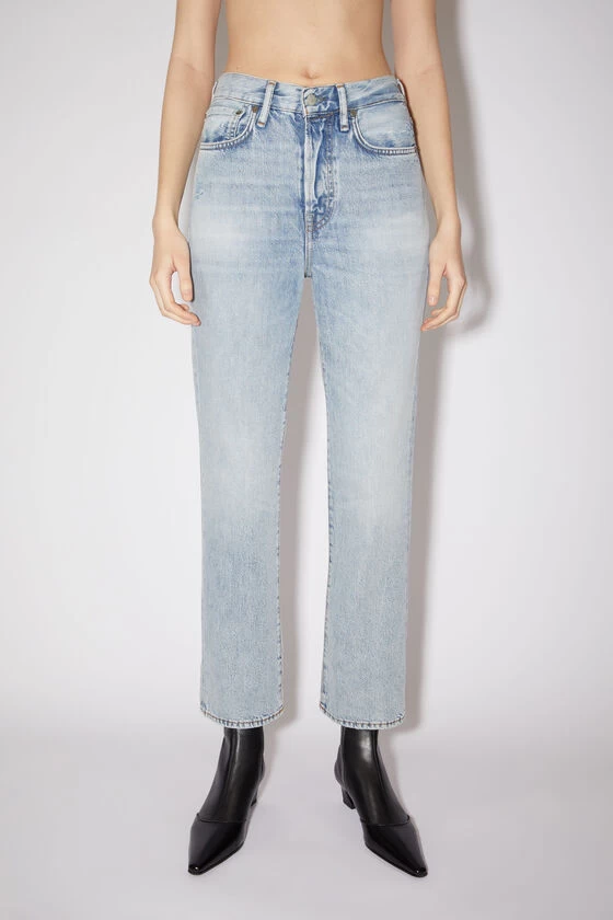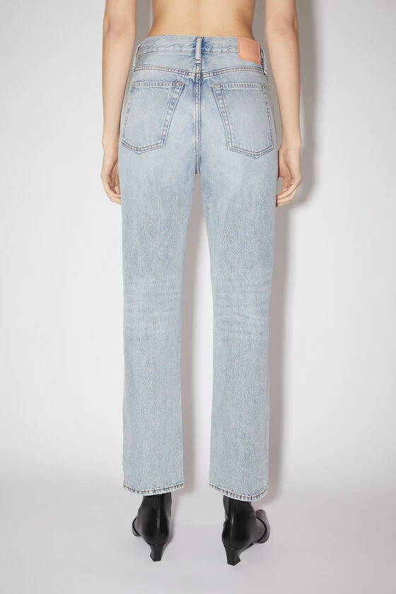 Acne Studios light blue regular fit jeans feature a 5-pocket denim construction with a high waist, straight leg and cropped length. The Mece jeans are crafted from rigid denim made of cotton.