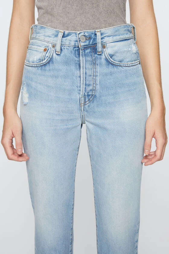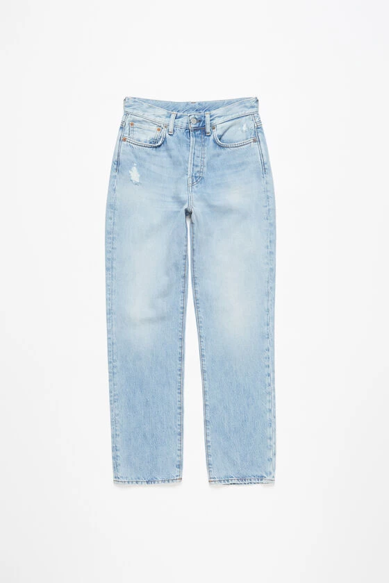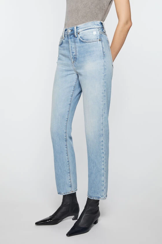 Acne Studios light blue regular fit jeans feature a 5-pocket denim construction with a high waist, straight leg and cropped length. The Mece jeans are crafted from rigid denim made of cotton.