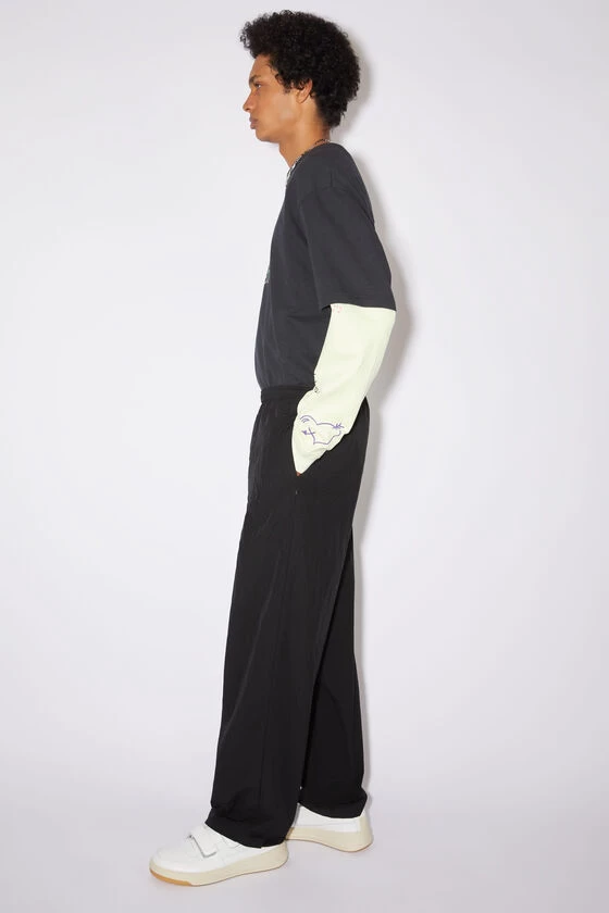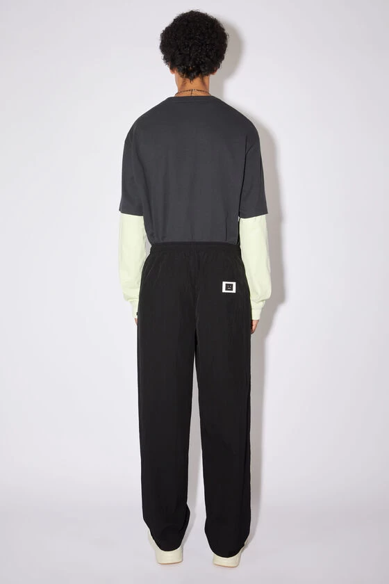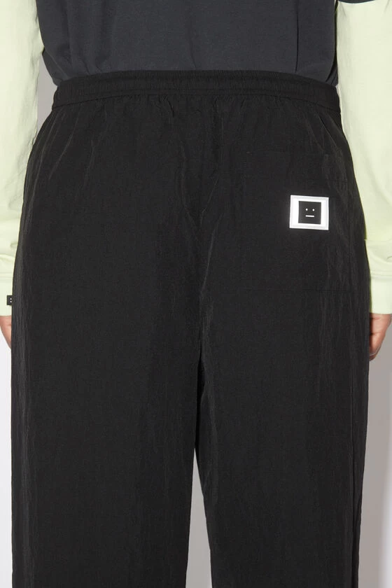 Acne Studios black trousers are crafted from nylon with a textured finish, detailed with a reflective face logo patch. Complete with an elasticated waistband, side seam pockets and a back patch pocket. Cut to a regular unisex fit with mid rise and long length.