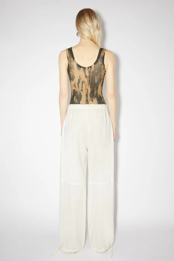 Acne Studios warm white trousers are crafted from a cotton and linen blend, detailed with raw edges and drawstrings on the elasticated waistband and bottom hem. Complete with pleats for extra knee width. Cut to a relaxed fit with a mid-waist, wide leg and long length.