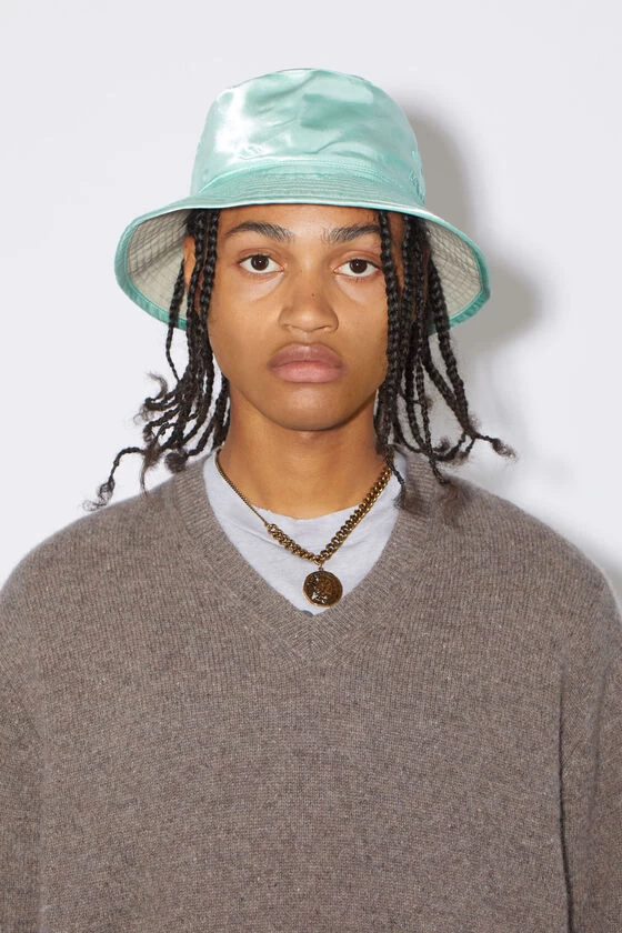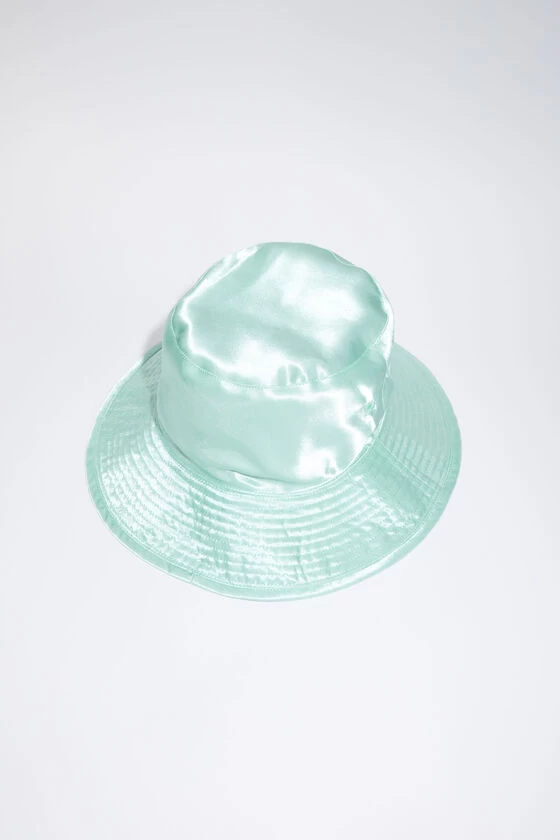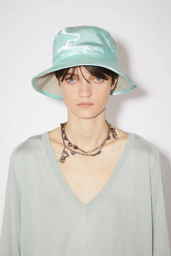 Acne Studios aquamarine bucket hat features a shiny satin fabric with an Acne Studios logo embroidery and a contrast reversible side,