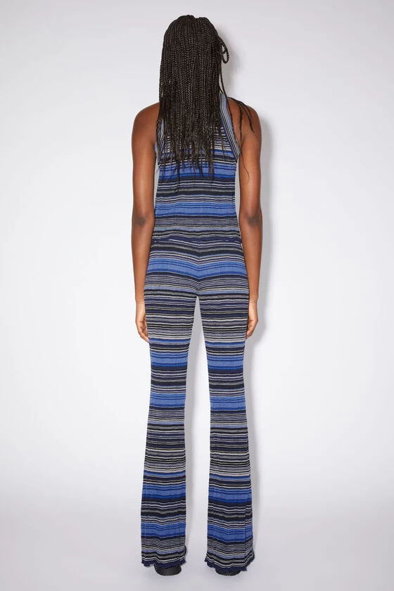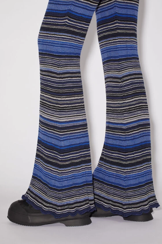 Acne Studios dark blue/multi trousers are crafted from cotton with an irregular ribbed finish, detailed with an all-over stripe pattern. Cut to a fitted fit, flared leg and long length.