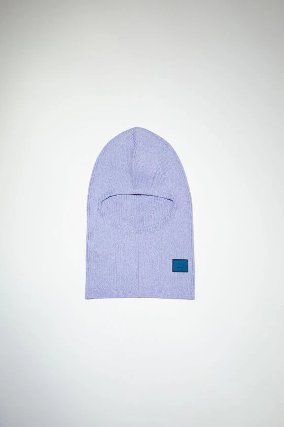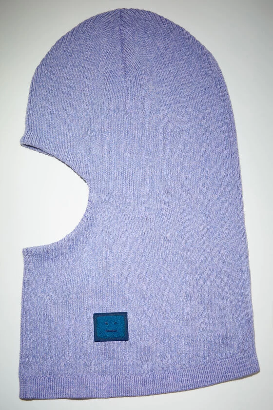 Acne Studios iris purple balaclava features a front opening and is detailed with a face logo patch. Crafted from recycled yarn and wool with a ribbed finish.