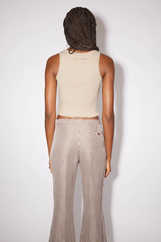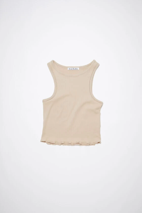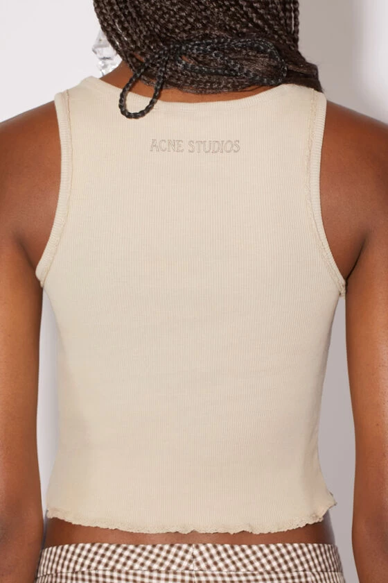 Acne Studios mushroom beige tank top is crafted from ribbed cotton with a faded finish. Adorned with a tonal seasonal logo on the back. Detailed with a lace ribbon finish on the sleeve opening and bottom hem. Cut to a slim fit and cropped length.