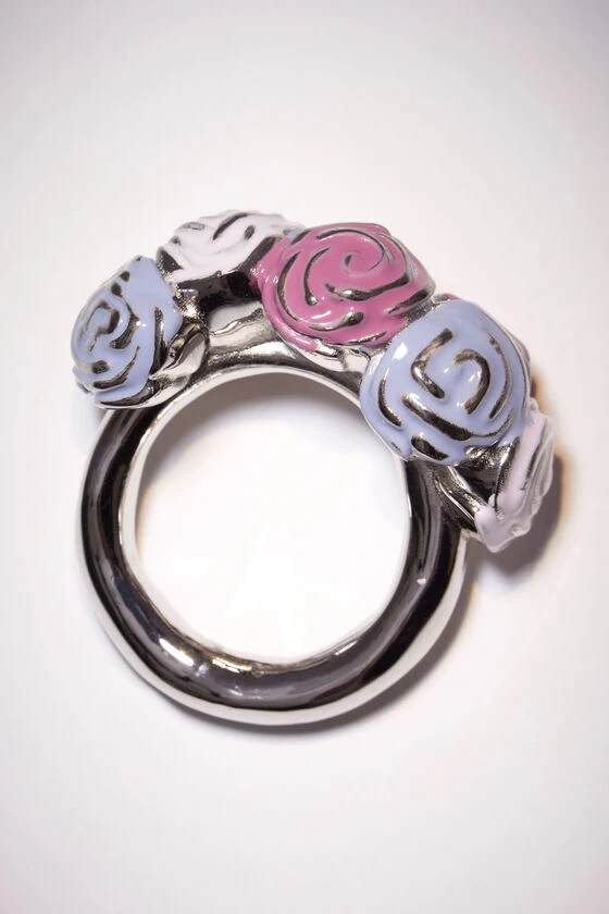 Acne Studios dusty lilac ring features roses and is crafted of aluminium.