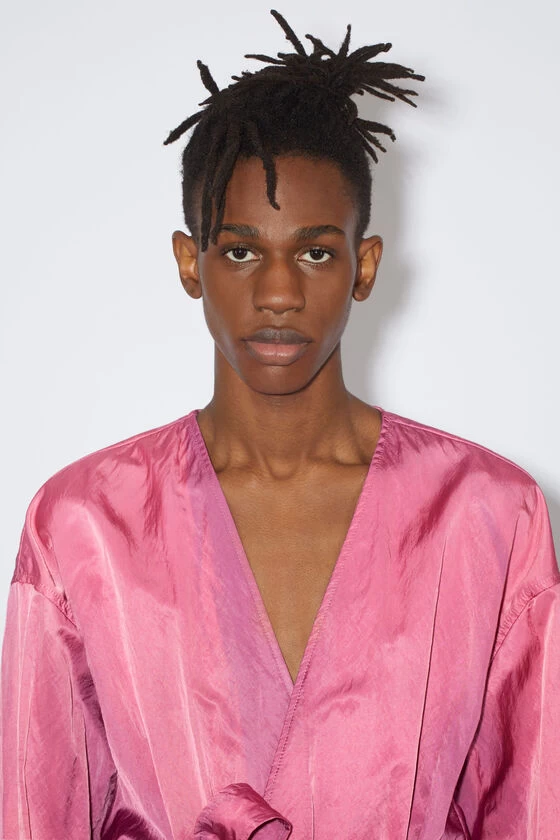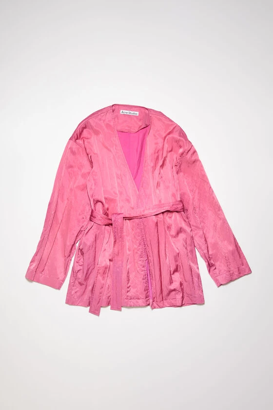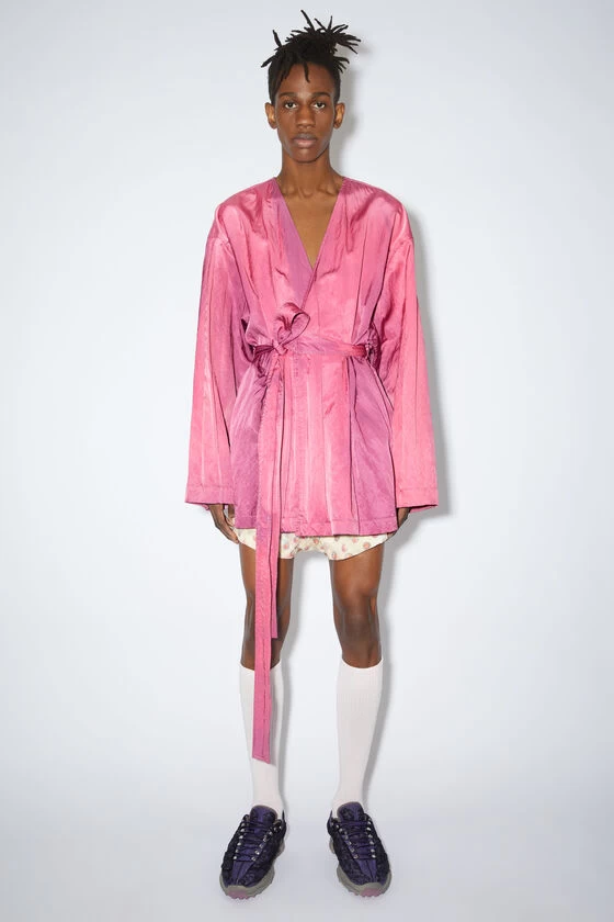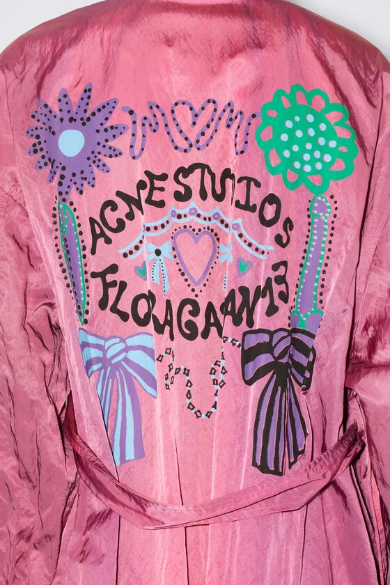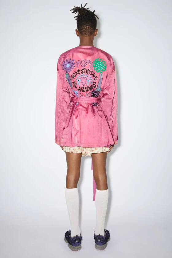 Acne Studios fuchsia pink overshirt is crafted from a satin fabric with a fluid hand feel and washed-out effect. Adorned with a seasonal painting print on the back and complete with a tie-up belted closure. Cut to a relaxed fit and regular length.