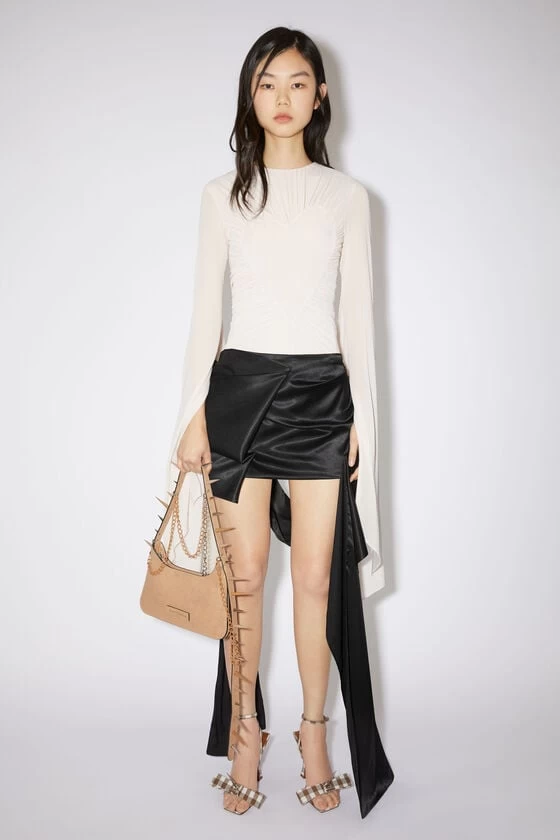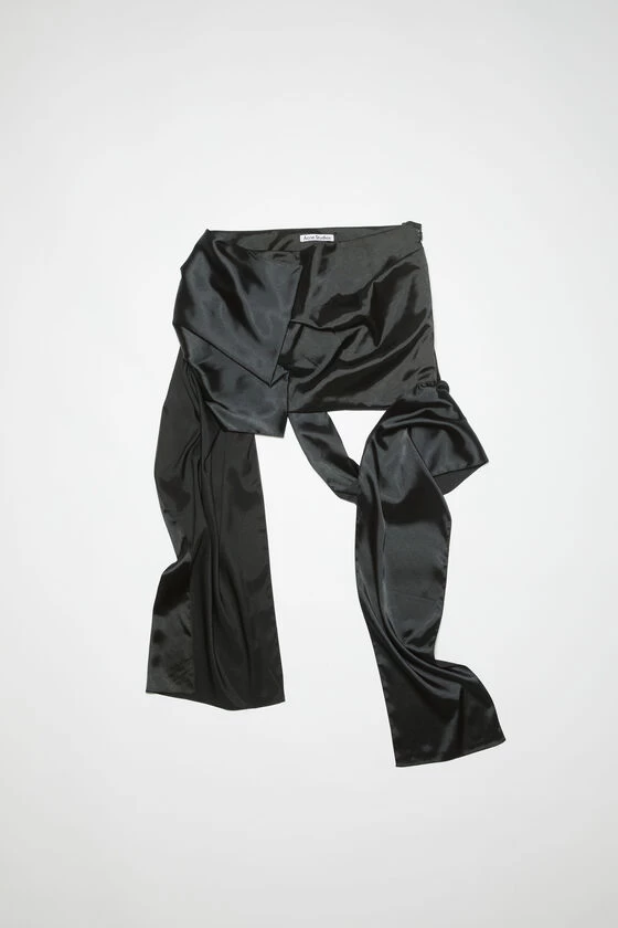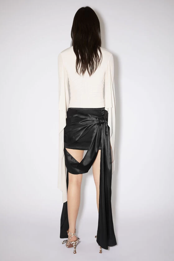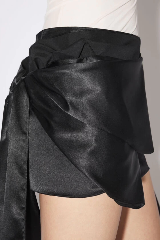 Acne Studios black mini skirt is crafted from a fluid satin fabric with a glossy appearance and features a dimensional draped bow. Cut to a relaxed fit with a short length a long draped details.