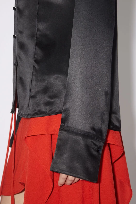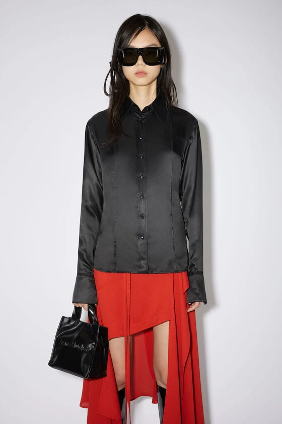 Acne Studios black button-up shirt is crafted from a silk blend satin fabric with a fluid hand feel. Cut to a regular fit with a hip length.
