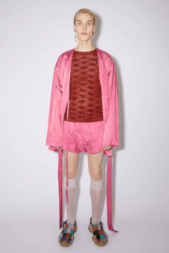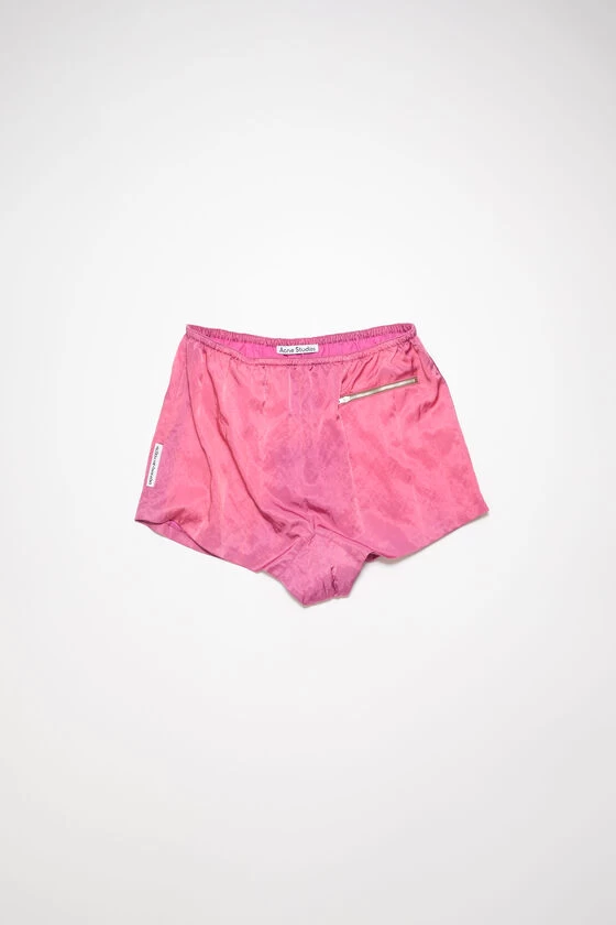 Acne Studios fuchsia pink shorts are crafted from a satin fabric with a faded effect, detailed with a seasonal Acne Studios flag label on the back pocket. Complete with a zippered coin pocket and elasticated waistband. Cut to a regular fit and a short length.