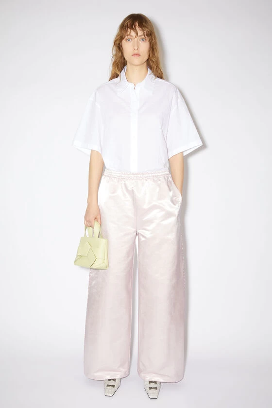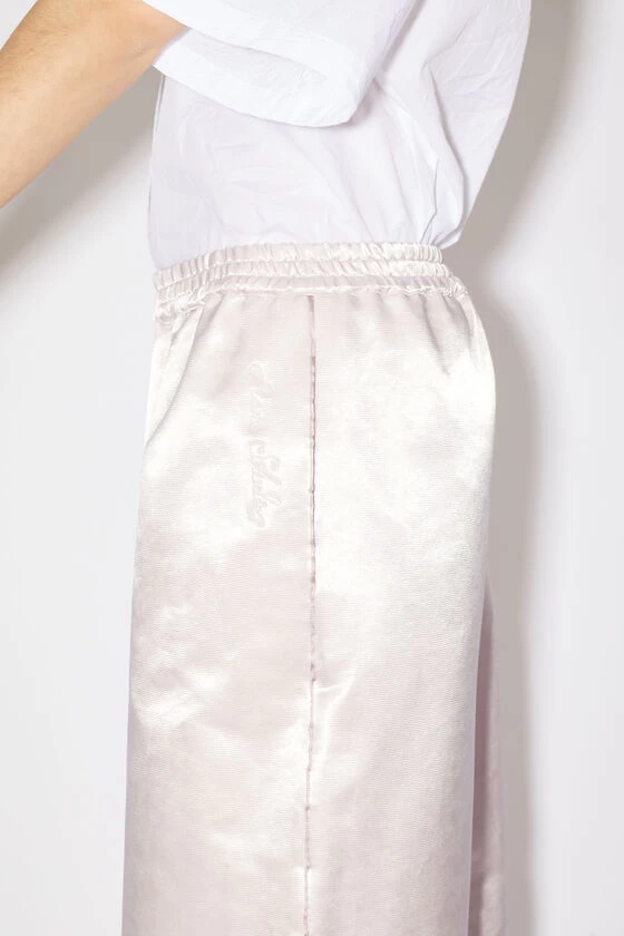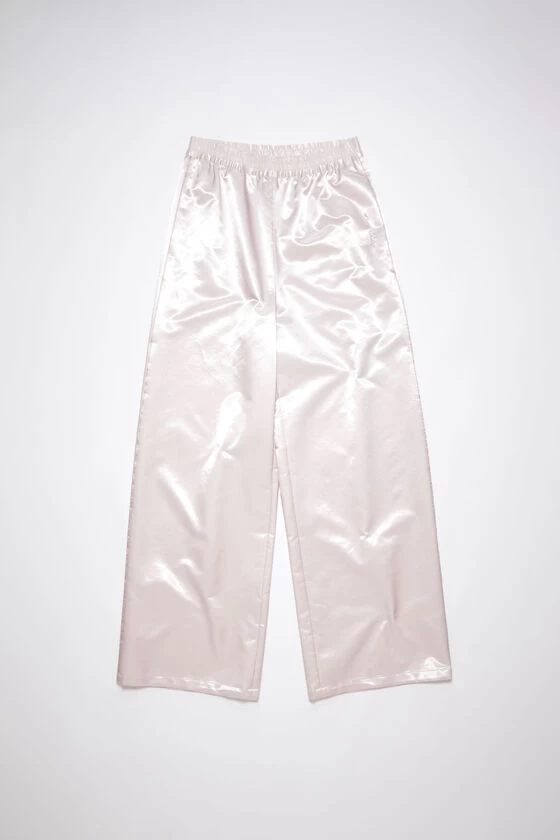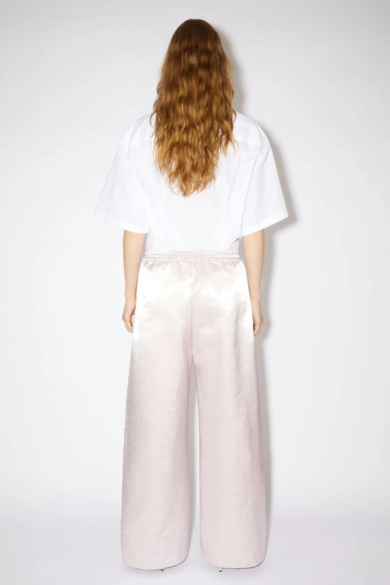 Acne Studios light pink trousers feature an Acne Studios embroidery, detailed with an elasticated waist and side pockets. Crafted from a satin fabric with a luminous finish. Cut to a relaxed fit and long length.
