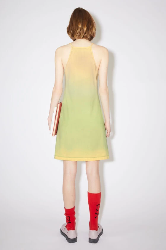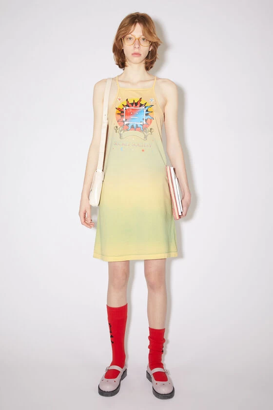 Acne Studios yellow/brown dress features a cracked screen print with a face logo and is crafted from a mid-weight jersey made of a cotton blend with a spray dye appearance.