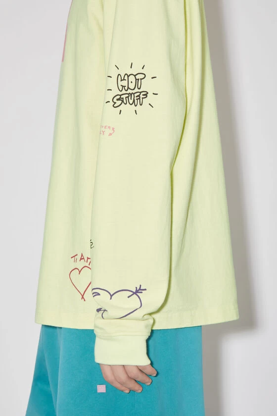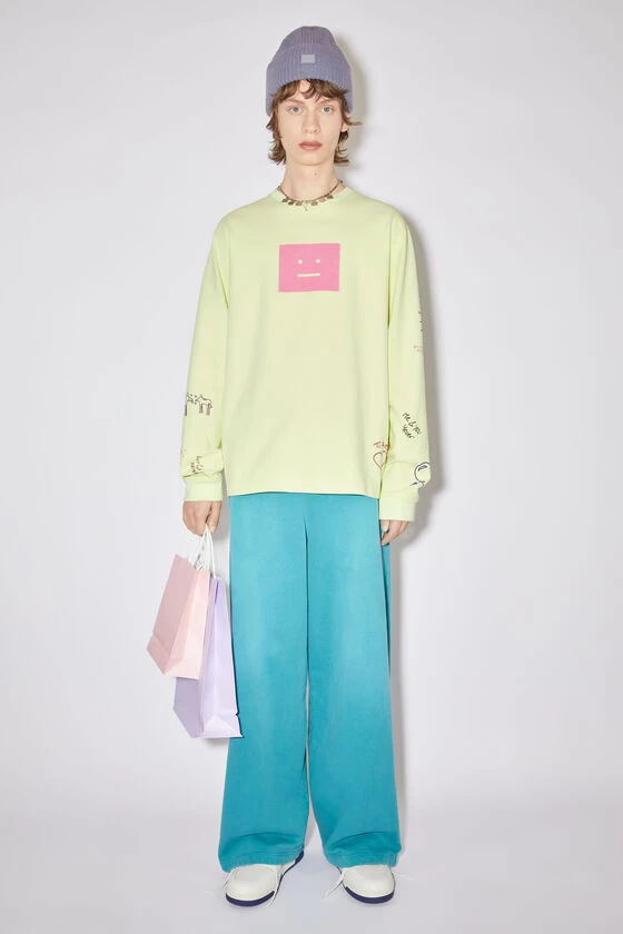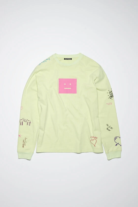 Acne Studios flou green long sleeve t-shirt is crafted from cotton, detailed with a face logo print on the chest and scribbles printed animation on the sleeves. Cut to regular unisex fit.