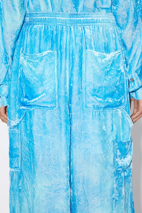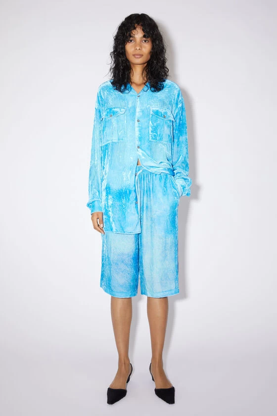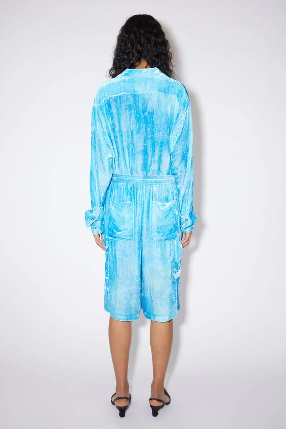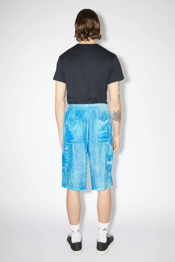 Acne Studios aqua blue shorts are crafted from a silk blend with a crushed velvet appearance, constructed entirely from excess fabrics and materials. Complete with side pockets, back pockets and a hammer loop.