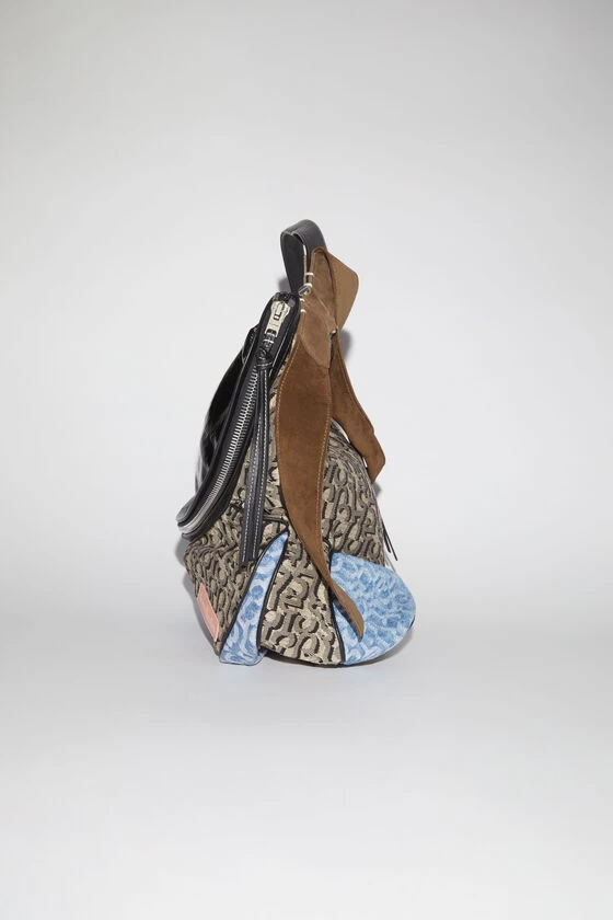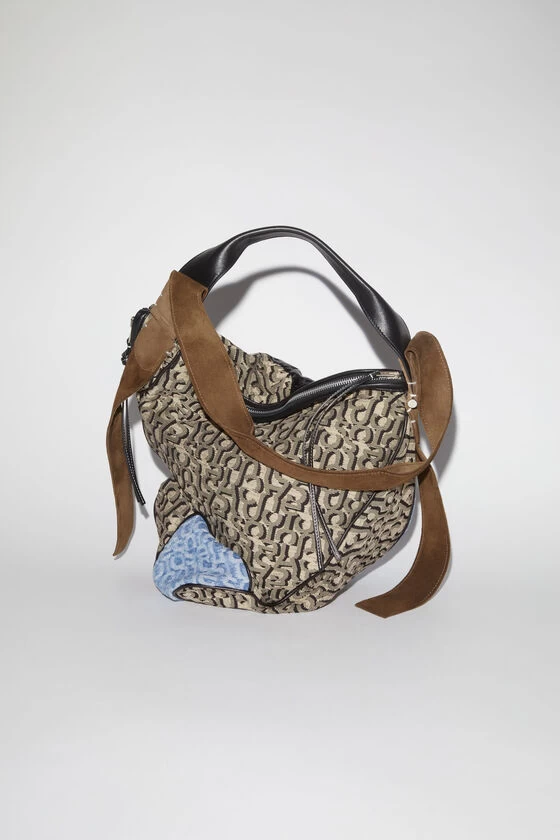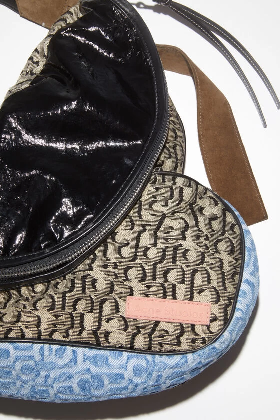 Acne Studios blue/black/beige shoulder bag is adorned with an exclusive monogram in jacquard and a contrast Acne Studios logo patch.