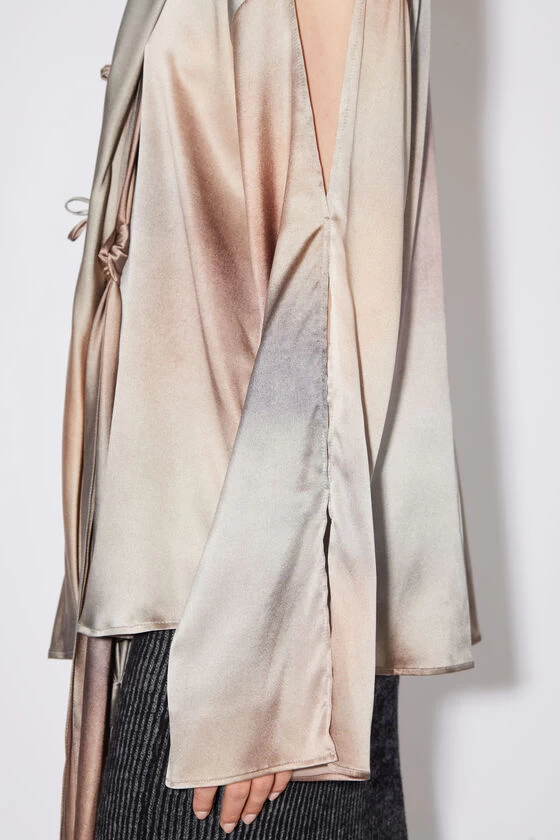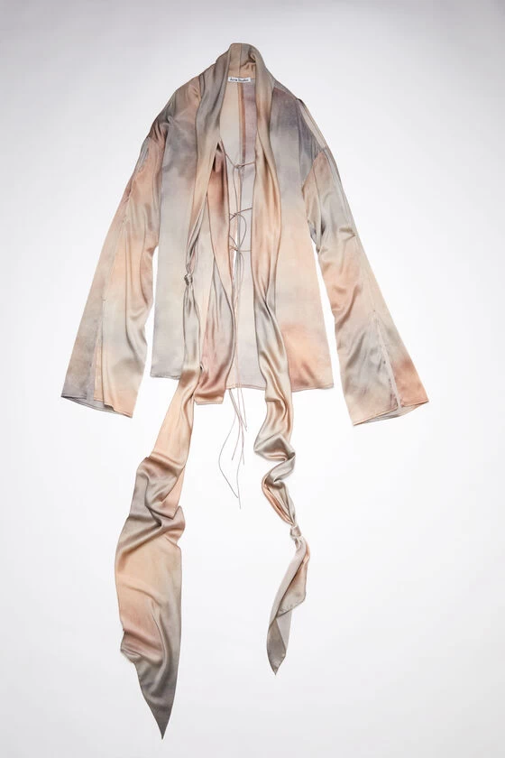 Acne Studios dark brown blouse features an exclusive colour wash print and is detailed with a long tie-up detailing and lace-up closure on the front. Adorned with slits on the back, shoulders and cuffs. Crafted from silk with a glossy fluid appearance. Cut to a relaxed silhouette with elongated flared sleeves.