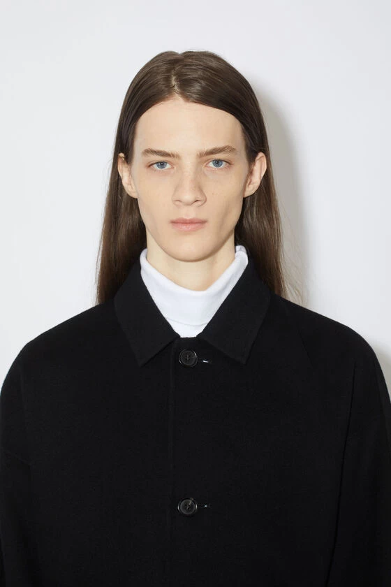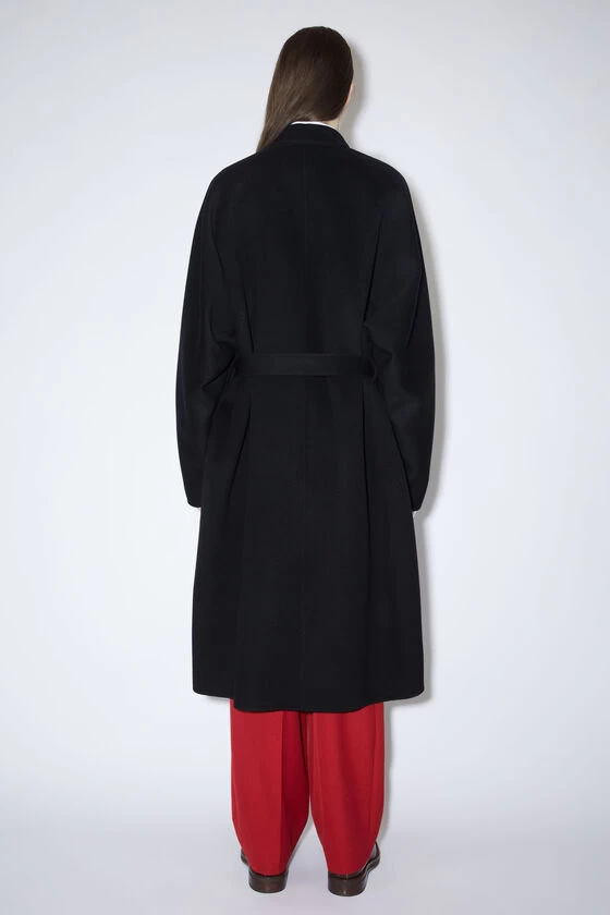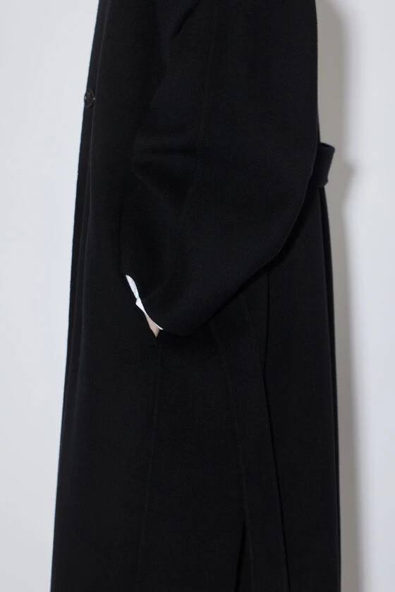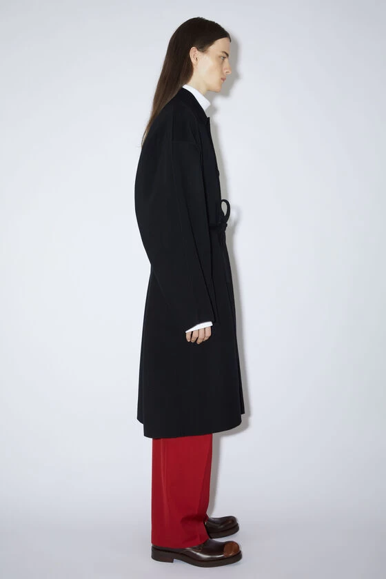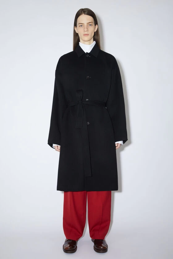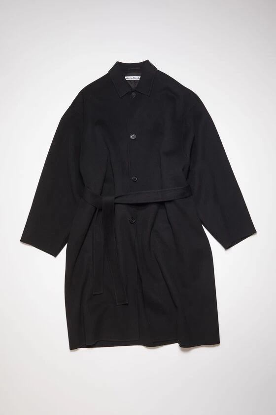 Acne Studios black single-breasted coat is crafted from double face wool, detailed with a belt and a button-up closure. Complete Side seam pockets and cut to a relaxed fit.
