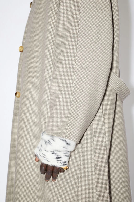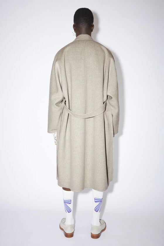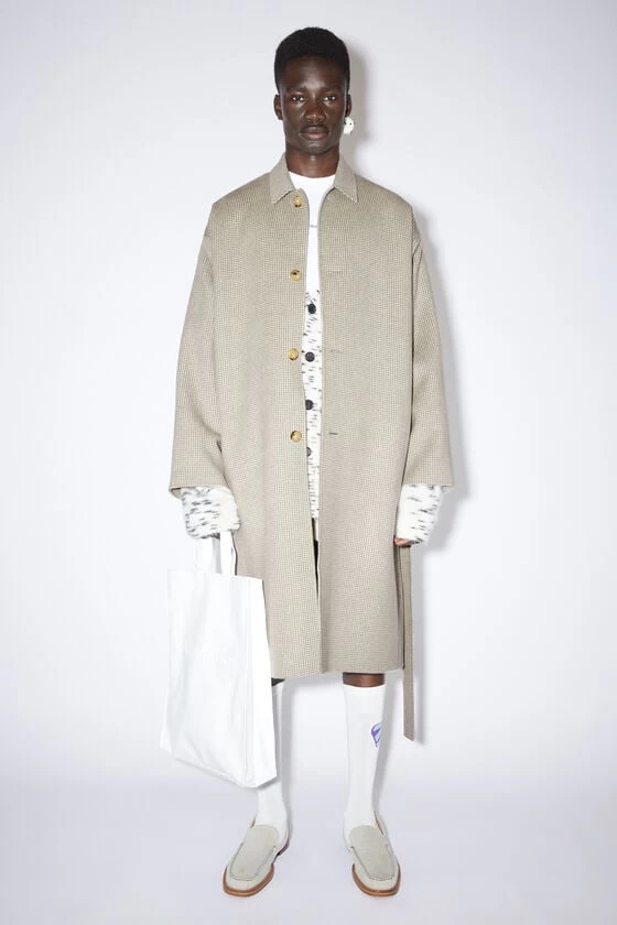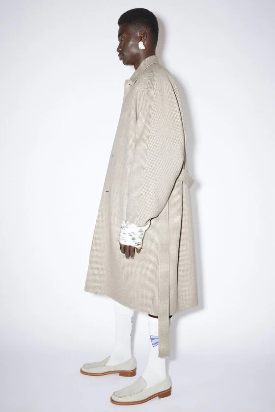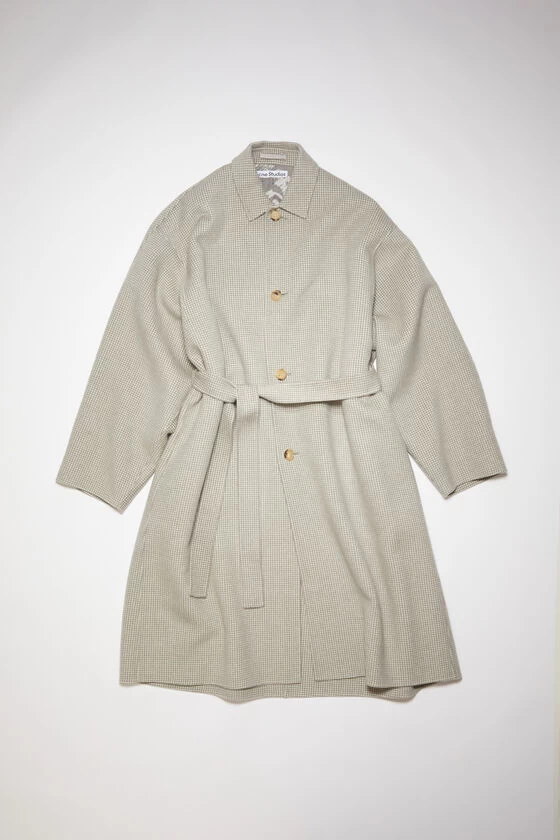 Acne Studios grey/off white single-breasted coat features a houndstooth pattern, crafted from double face wool. Detailed with a button closure, belt and side pockets. Cut to a relaxed fit and mid-length.