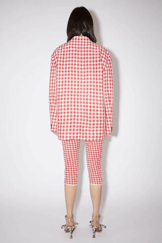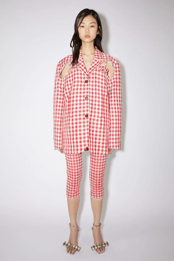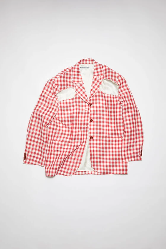 Acne Studios cardinal red single-breasted suit jacket features a gingham pattern and is crafted from a linen blend. Complete with a centre front button-up closure, front pockets and raw edge cut-out details on the front. Cut to a relaxed fit with dropped shoulders and a hip length.