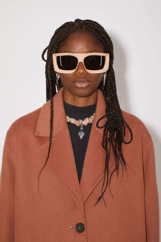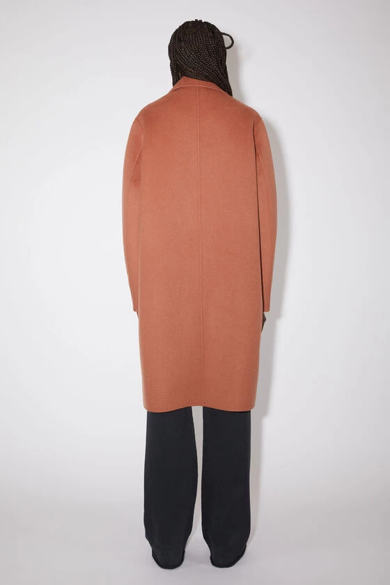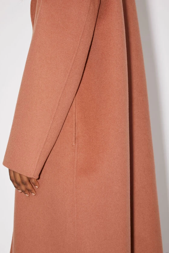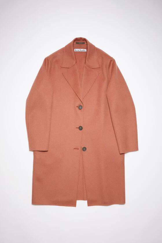 Acne Studios rose pink single-breasted coat is crafted from double face wool, detailed with a centre front button-up closure and side pockets. Cut to a relaxed fit with a mid-length.