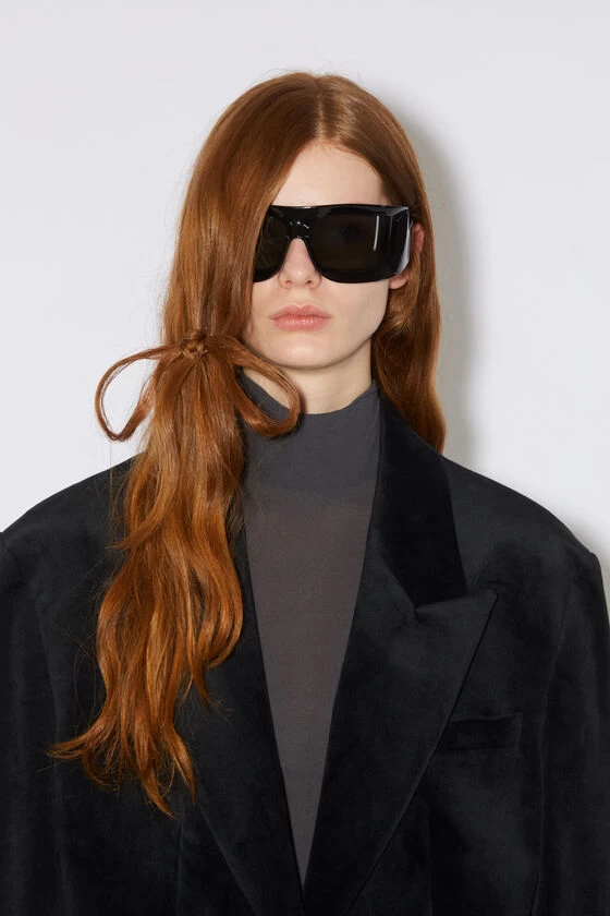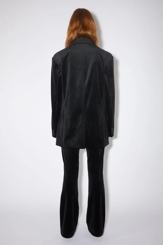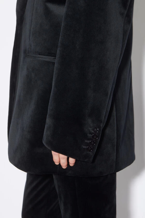 Acne Studios black single-breasted jacket is crafted from velvet fabric with a luminous and fluid finish, detailed with a singular button-up closure. Complete with two jetted from pockets and a chest pocket. Cut to a relaxed fit with a below hip length.