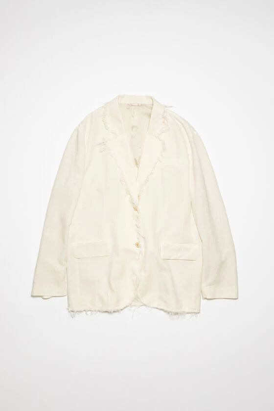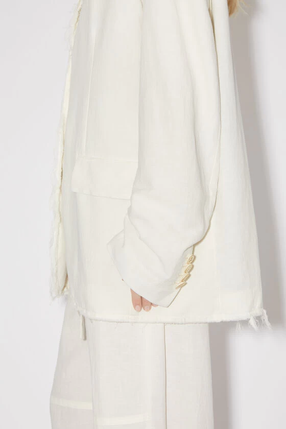 Acne Studios warm white single-breasted tailored jacket is crafted from a cotton and linen blend with a garment-dyed finish raw edge detailing. Complete with a chest welt pocket and jetted flap pockets. Cut to an exaggerated fit with dropped soft shoulders and a below hip length.
