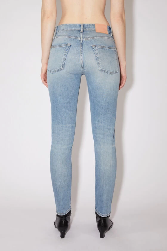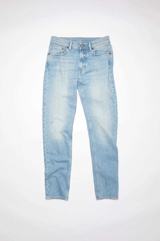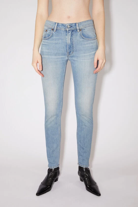Acne Studios light blue slim fit jeans feature a 5-pocket denim construction with a high waist, tapered leg and cropped length. The Melk jeans are crafted from comfort stretch denim made of cotton.