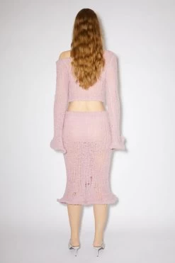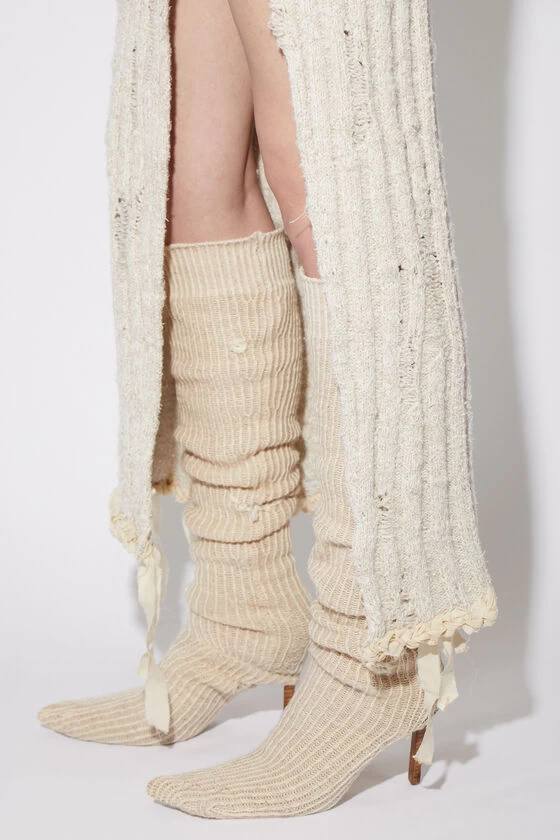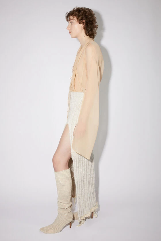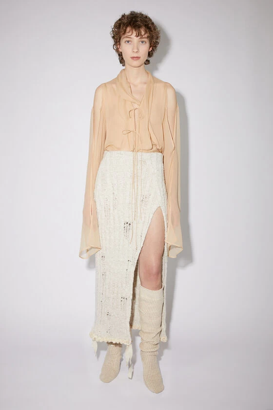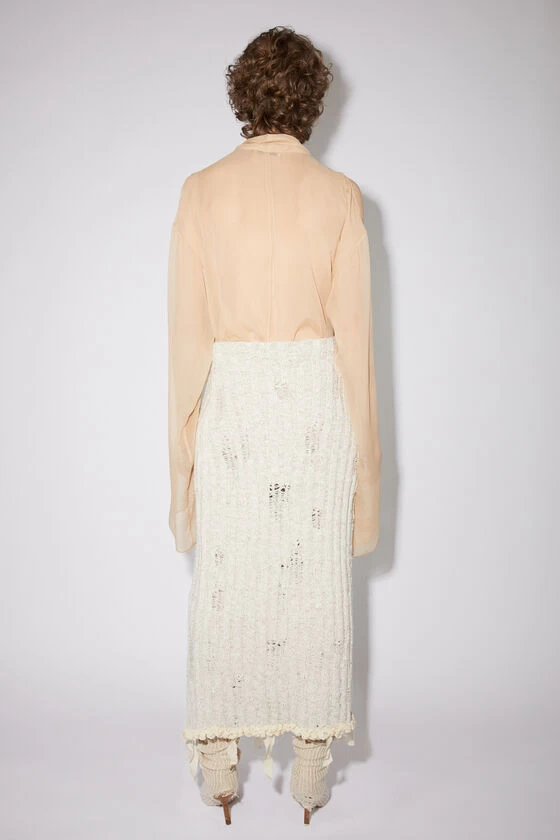 Acne Studios ecru/white skirt features deconstructed and distressed details crafted from crochet wool-blend, completed with a long slit. Cut to a fitted silhouette with a full length.