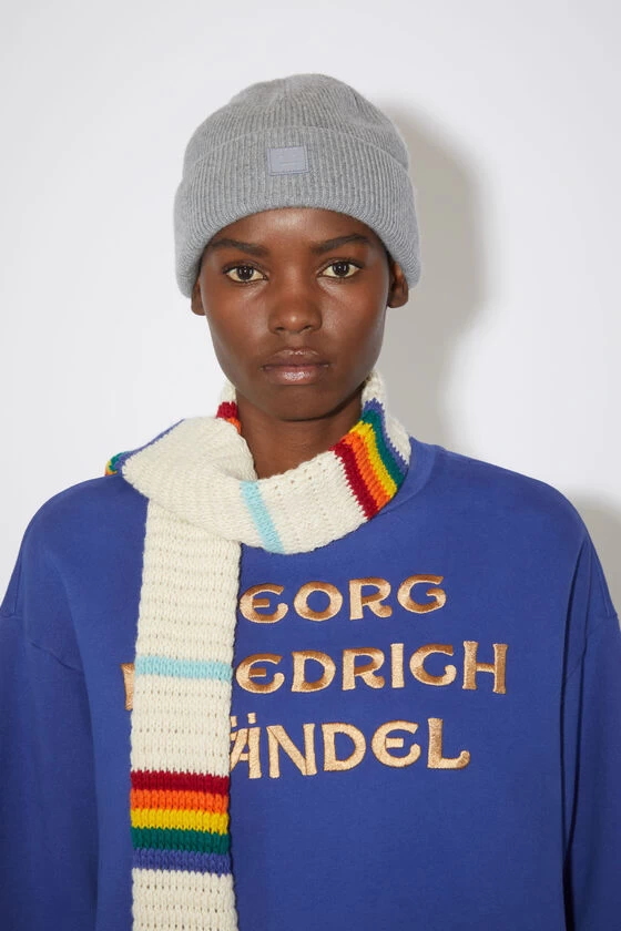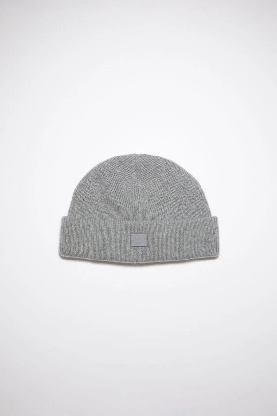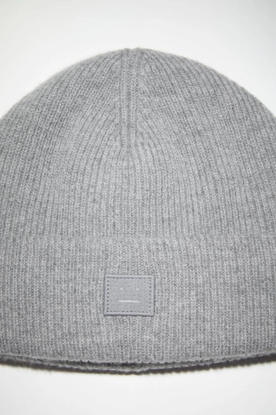 Acne Studios grey melange knit beanie features a small embroidered face logo patch and ribbed detailing, crafted from chunky wool.