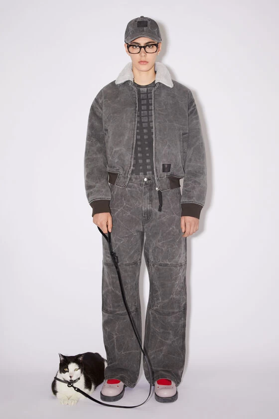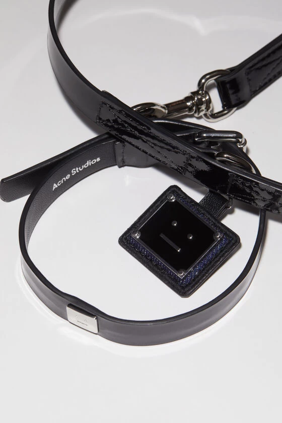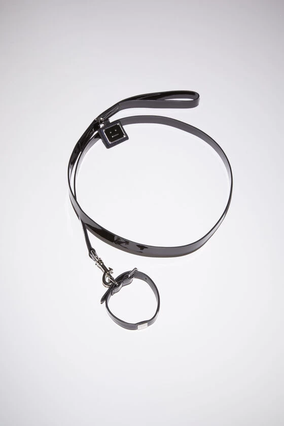 Acne Studios black/black pet leash is detailed with a metal face logo plaque and features a thin patent leash with a glossy finish.