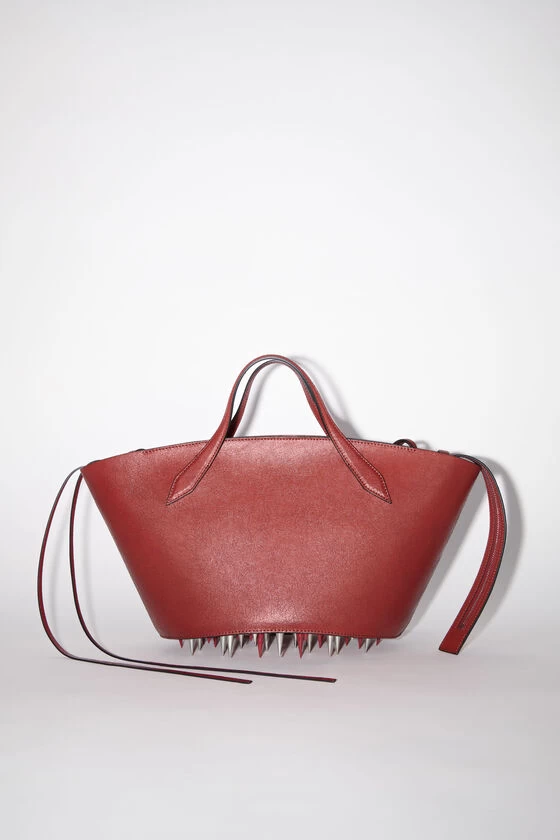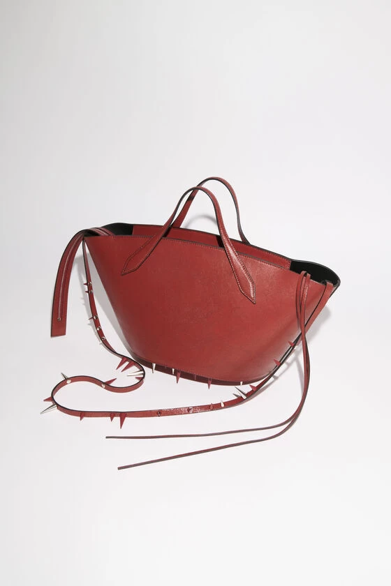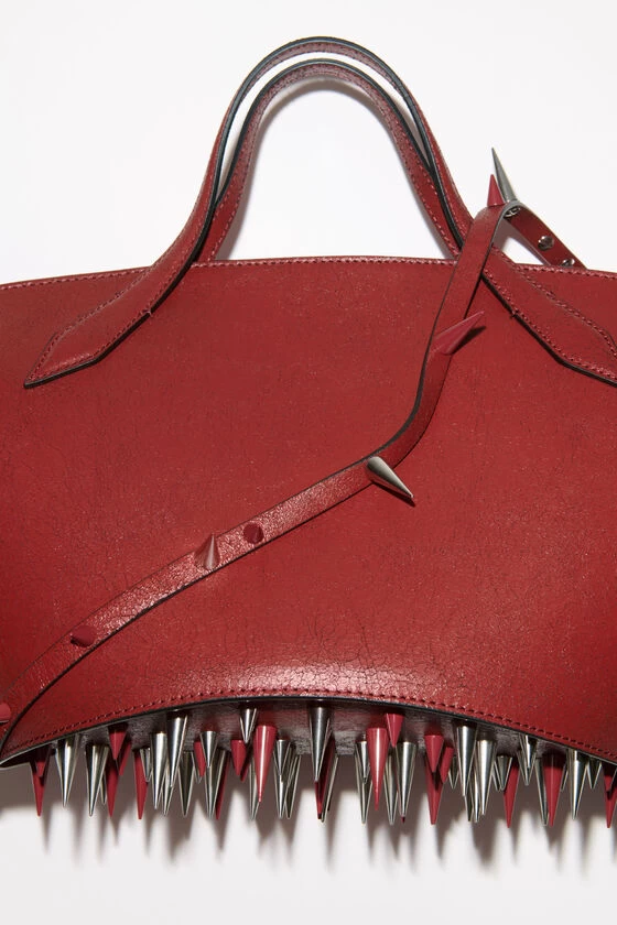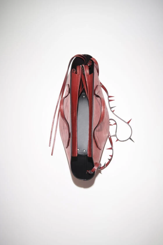 Acne Studios red shoulder bag is crafted from suede leather with a cracked finish and adorned with spikes details. Complete with a shoulder strap and top handle.