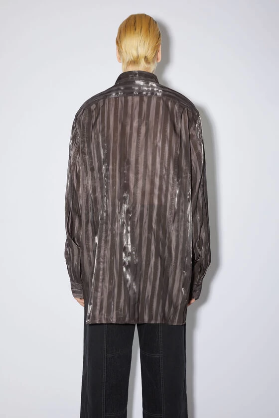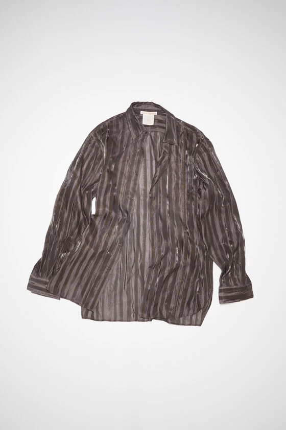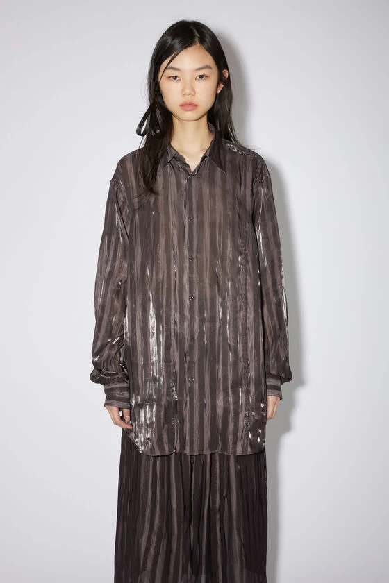 Acne Studios chestnut brown button-up shirt features a stripe pattern, crafted from satin fabric constructed entirely from excess fabrics and materials. Cut to a relaxed fit with a regular length.