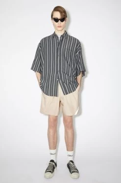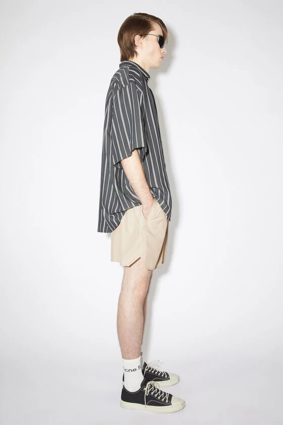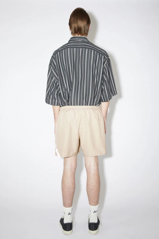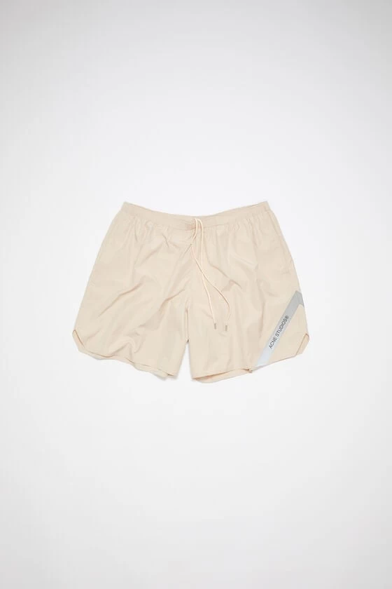 Acne Studios shell beige swim shorts feature an Acne Studios logo reflective tape on the leg and side seam pockets. Complete with an elasticated waistband with a functional drawstring. Cut a relaxed fit with a regular rise.