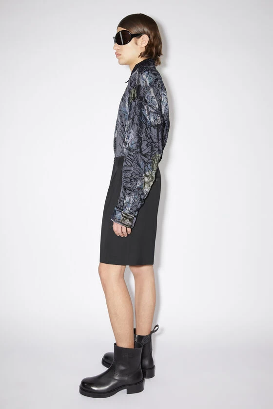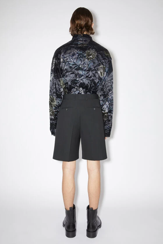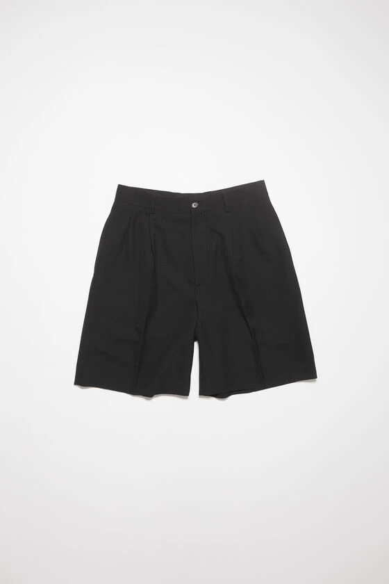 Acne Studios black pleated shorts are crafted from a wool blend and cut to a regular fit. Complete with front slanted pockets and back jet pockets with button closures.
