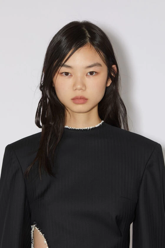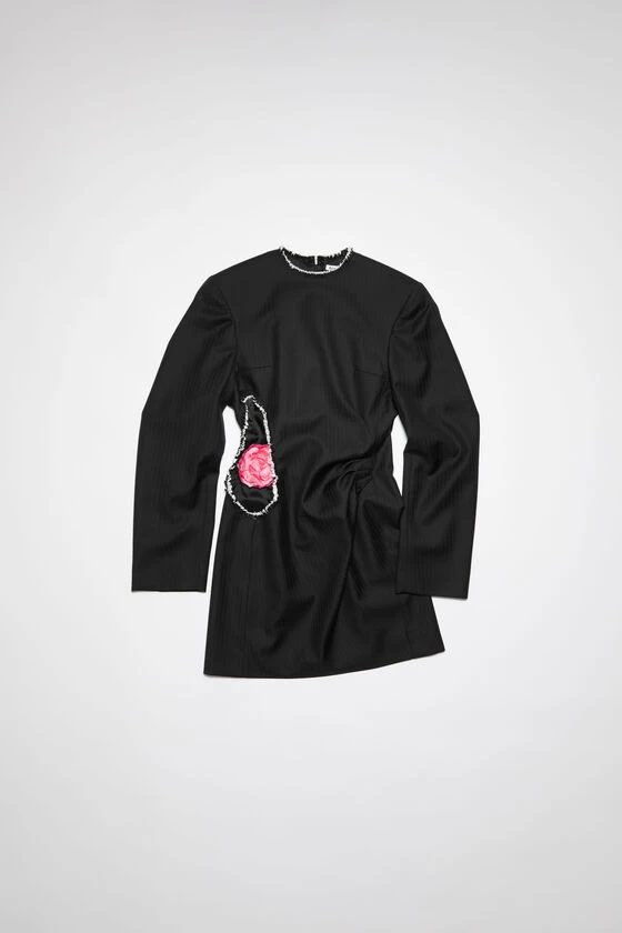 Acne Studio black tailored long sleeve dress is crafted from wool, adorned with raw edge cut-out and belted rose. Cut to a regular fit with a high neck and mid-thigh length.