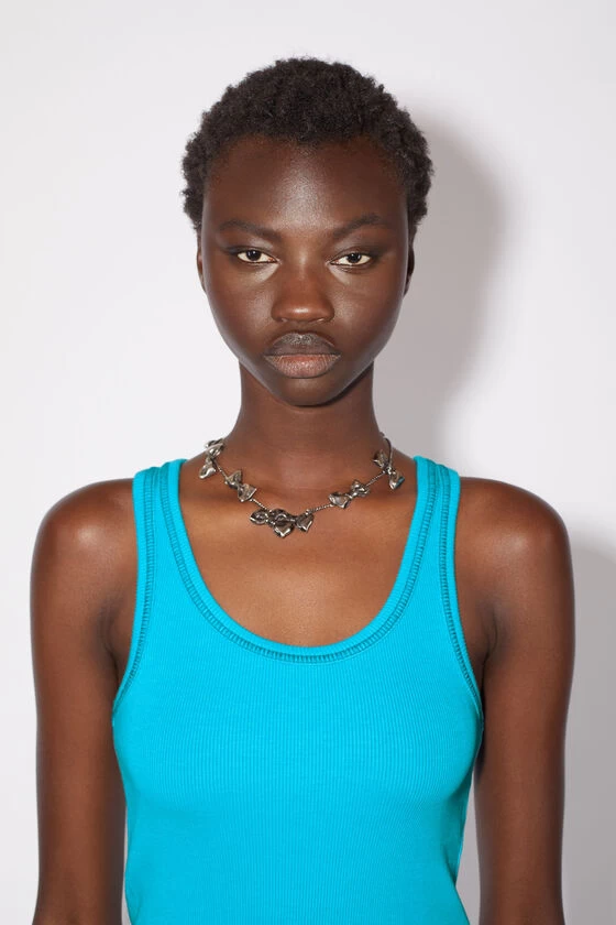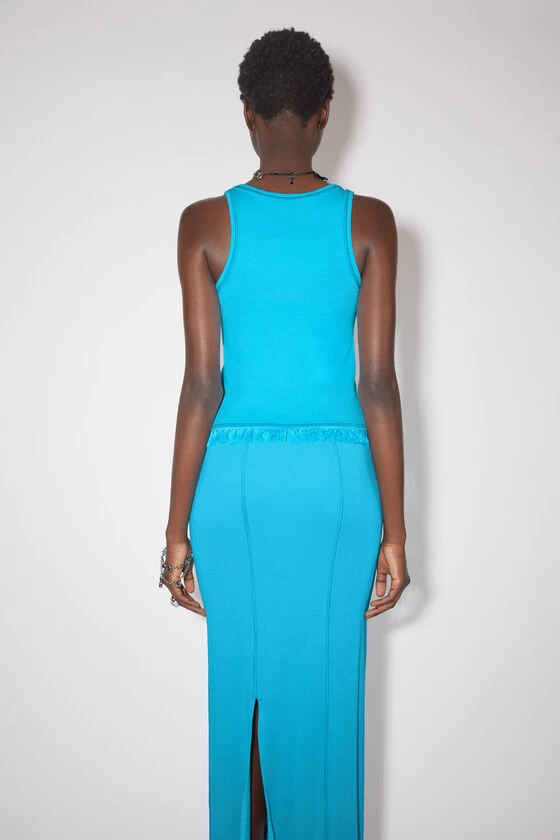 Acne Studios turquoise tank top is crafted from ribbed cotton, adorned with tonal stitching and tassel details on the bottom hem. Cut to a slim fit and hip length.