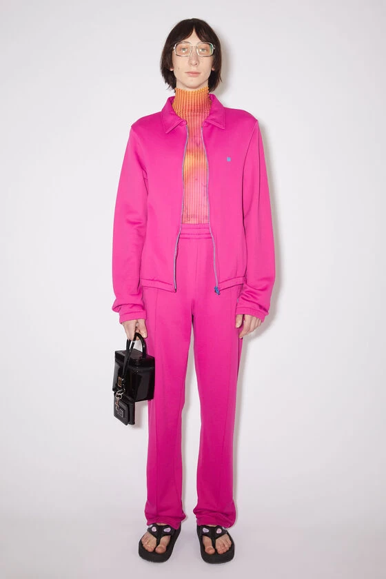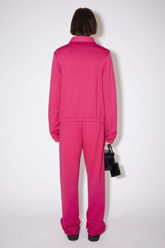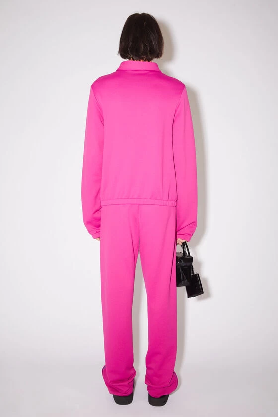 Acne Studios fuchsia pink sweater features a contrast metallic zippered closure with a wavy appearance. Adorned with a micro face patch on the chest, detailed with side welt pockets, elasticated cuffs and hem. Cut to a fitted silhouette and a regular length.