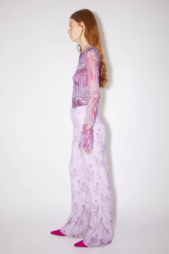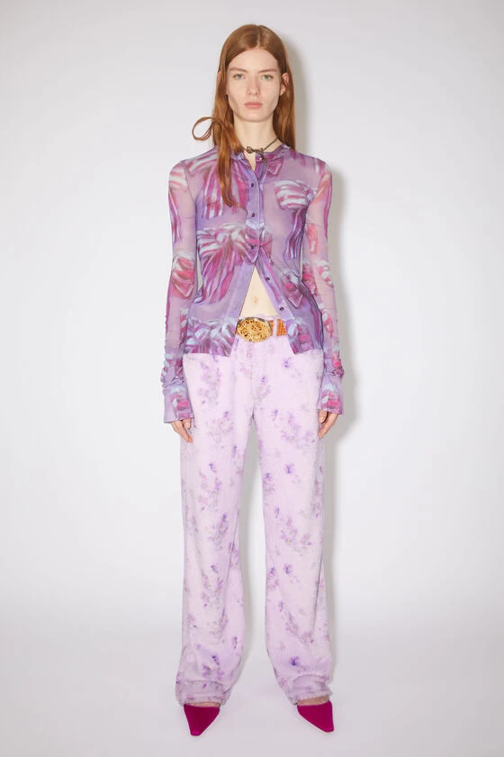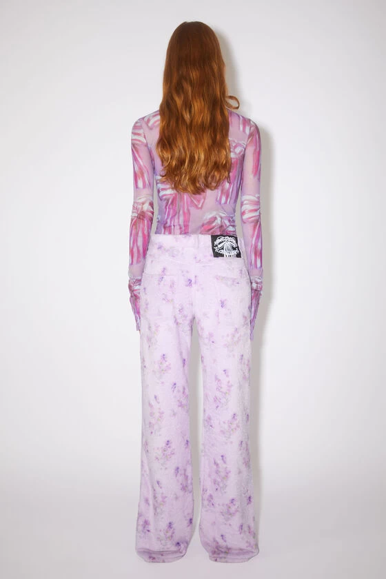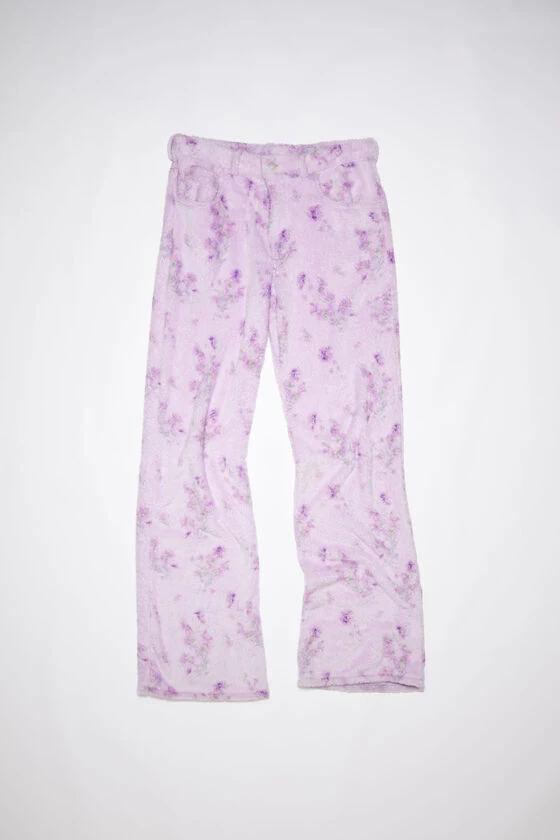 Acne Studios orchid purple trousers feature a 5-pocket construction and are crafted from a soft teddy fabric detailed with an all-over print. Complete with a seasonal logo flag on the back. Cut to a relaxed fit with a mid-rise, wide leg and long length.
