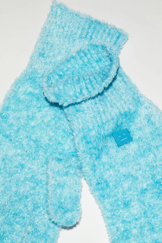 Acne Studios teal blue gloves are crafted from a printed two-toned yarn with a soft hand feel and textured appearance. Adorned with a micro face logo patch on each glove and ribbed details at the cuff.