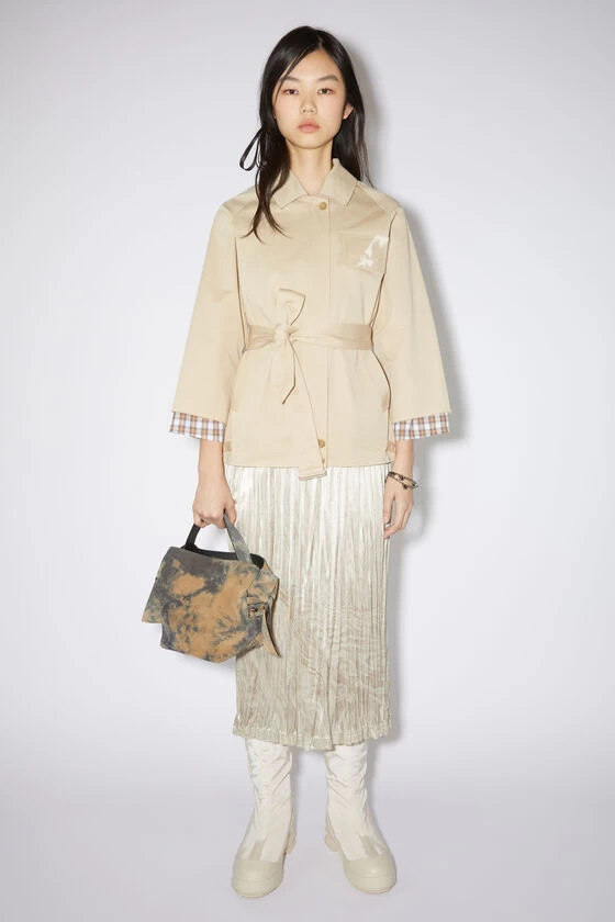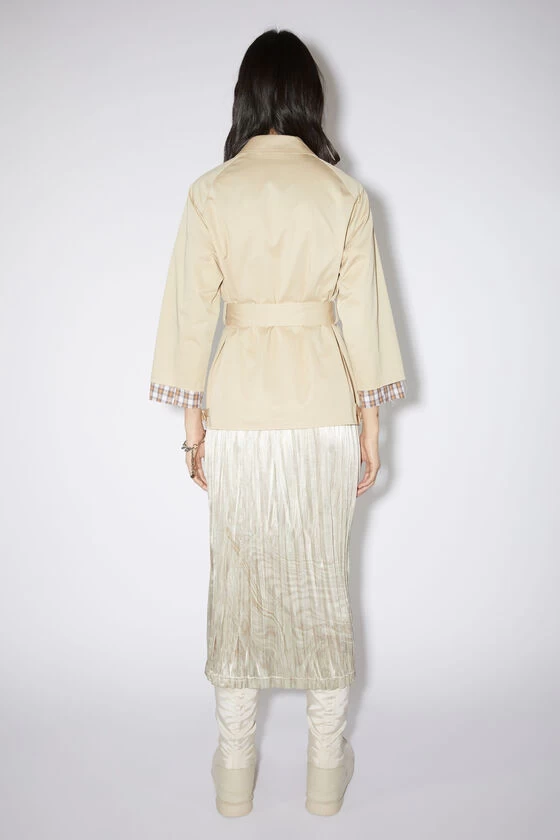 Acne Studios beige trench belted jacket features a discrete button-up closure, detailed with exposed sleeve lining. Cut to a relaxed fit.