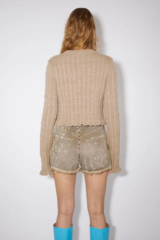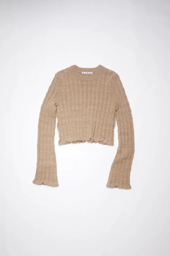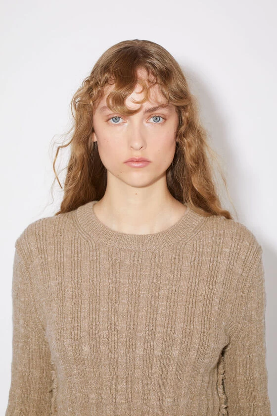 Acne Studios toffee brown crew neck jumper is crafted from a wool-cotton blend with a ribbed finish and adorned with frayed seams. Cut to a fitted fit, elongated sleeves and a below waist length.